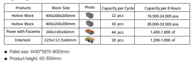 이 장비는 일반 블록, 장식 블록, 단열 블록 등 다양한 기능 유형을 포괄하는 다양한 중공 벽돌 제품을 생산합니다. 구멍 모양에는 사각형 구멍과 원형 구멍이 있으며, 배열에 따라 1열, 2열, 다열 구멍 구조를 구현할 수 있습니다. 금형을 변경하거나 장비 매개변수를 조정함으로써 다양한 유형의 벽돌 제품을 유연하게 전환하여 다양한 시장 수요를 충족할 수 있습니다.