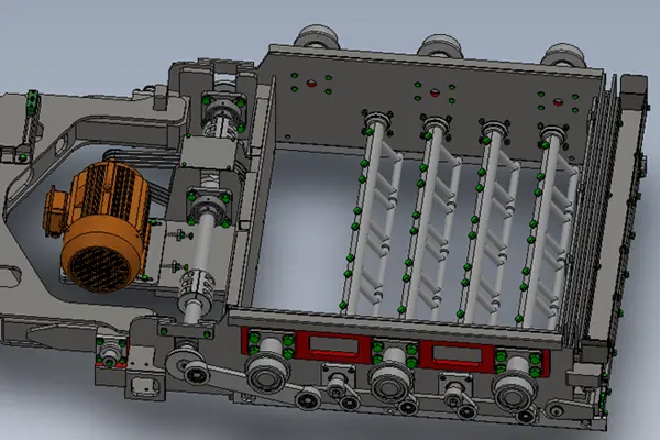 4정지 공급 시스템 매달린 공급 시스템은 공급 상자, 스크레이퍼, 탬퍼 브러시 및 아치 파괴 장치를 통합하는 모듈식 설계를 채택합니다. 페이스 믹스와 베이스 믹스 피딩 박스 모두 피딩 프레임에 장착되어 있어 신속한 교체와 최적의 피딩 성능이 가능합니다.